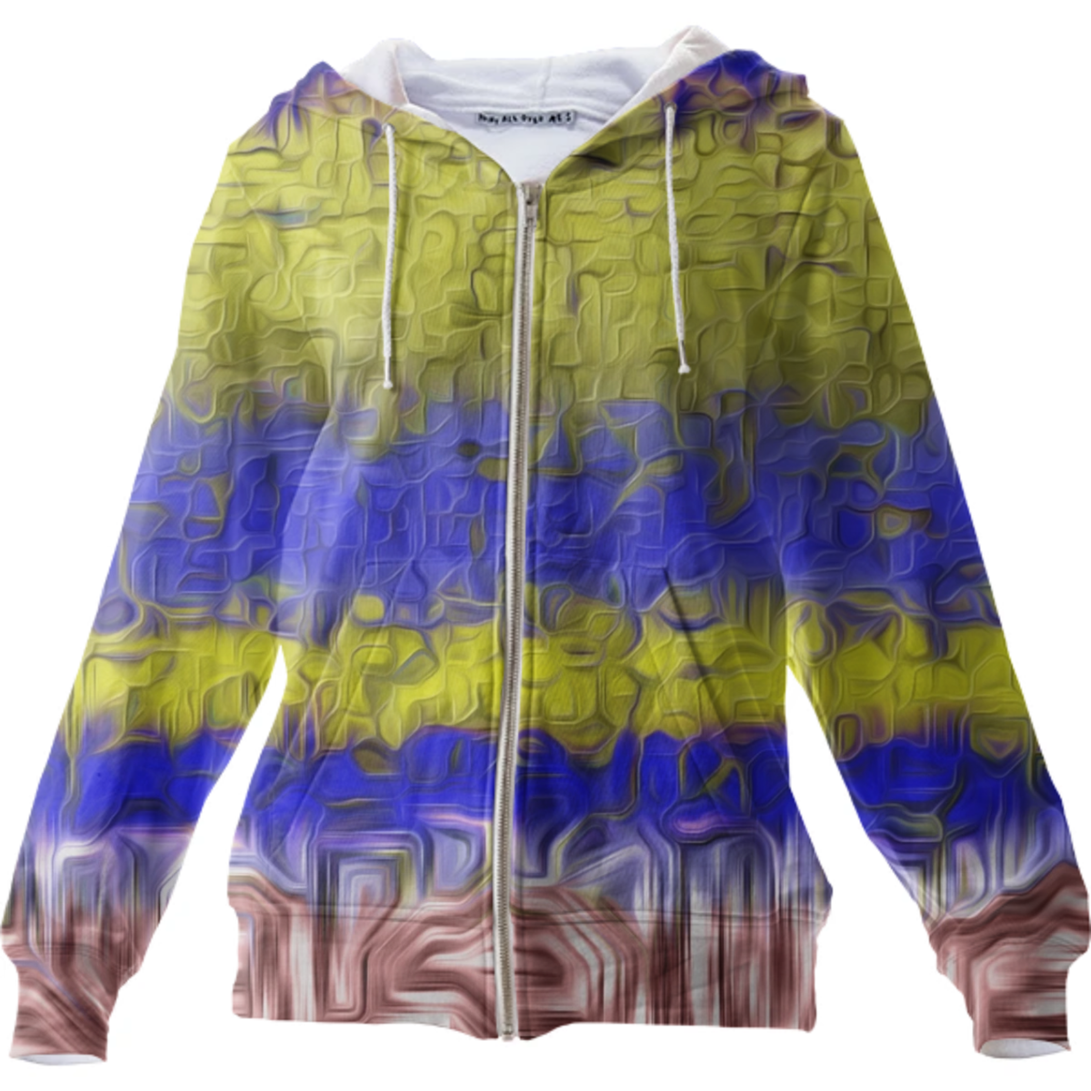 Slim fitting zip up hoodie with front kangaroo pockets metal zipper and drawstring hood.