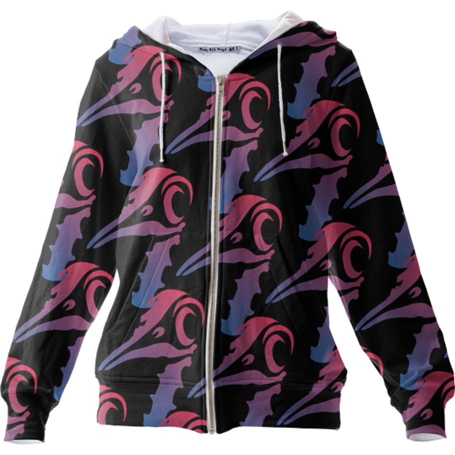 Slim fitting zip up hoodie with front kangaroo pockets metal zipper and drawstring hood.
