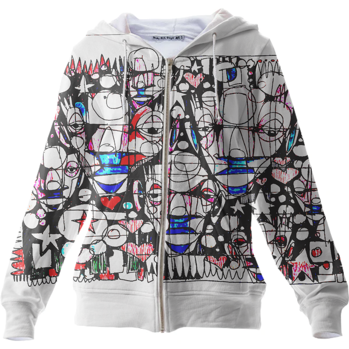 Slim fitting zip up hoodie with front kangaroo pockets metal zipper and drawstring hood.