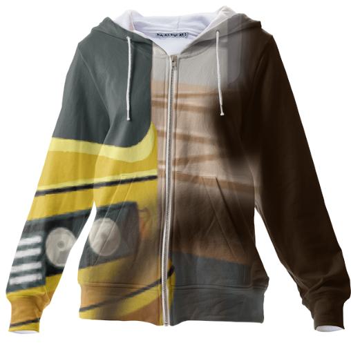 Slim fitting zip up hoodie with front kangaroo pockets metal zipper and drawstring hood.
