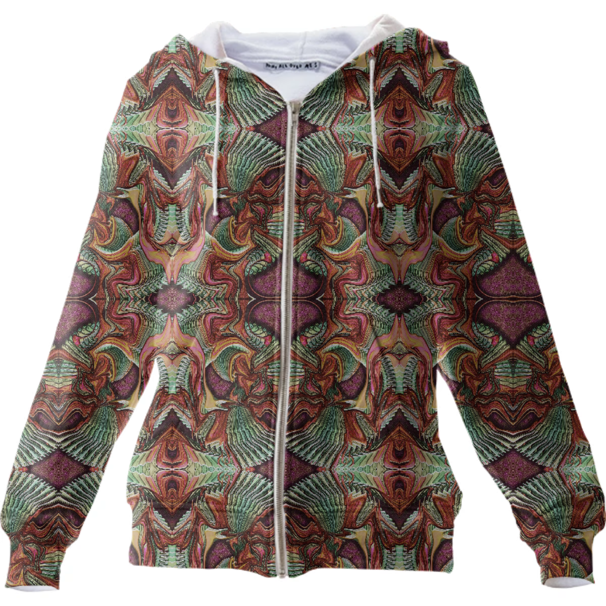 Slim fitting zip up hoodie with front kangaroo pockets metal zipper and drawstring hood.
