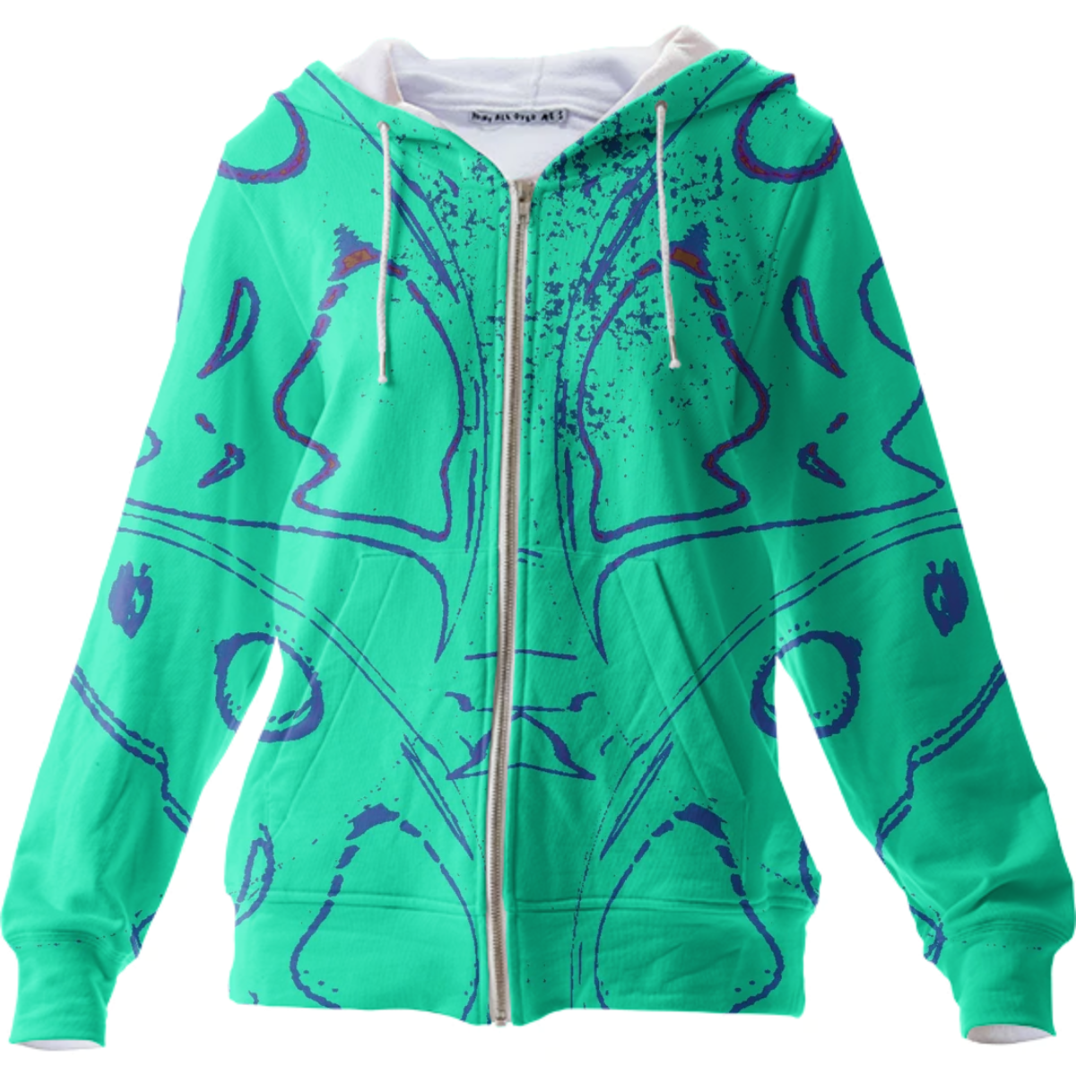 Slim fitting zip up hoodie with front kangaroo pockets metal zipper and drawstring hood.