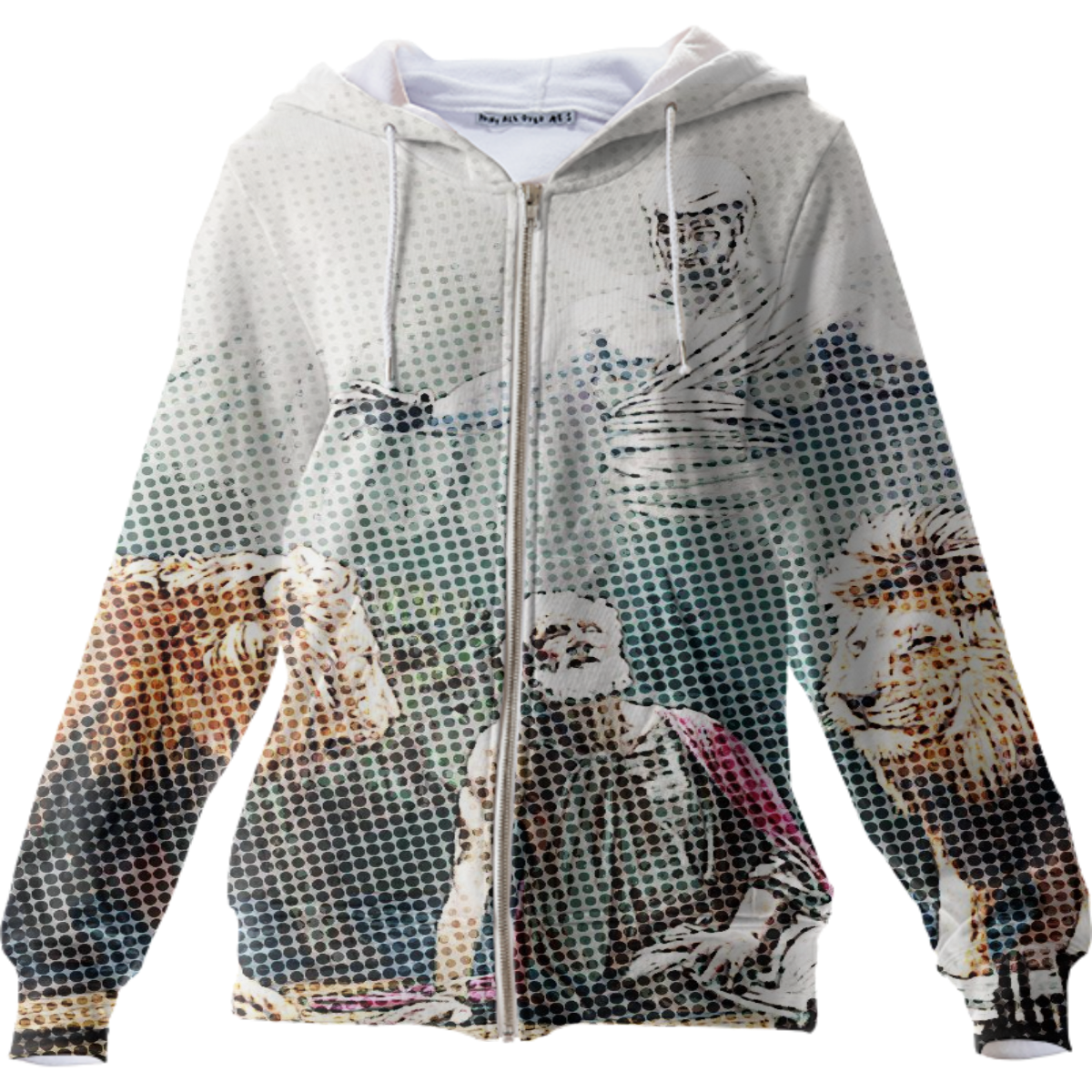 Slim fitting zip up hoodie with front kangaroo pockets metal zipper and drawstring hood.