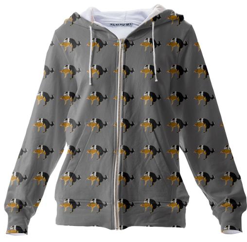 Slim fitting zip up hoodie with front kangaroo pockets metal zipper and drawstring hood.