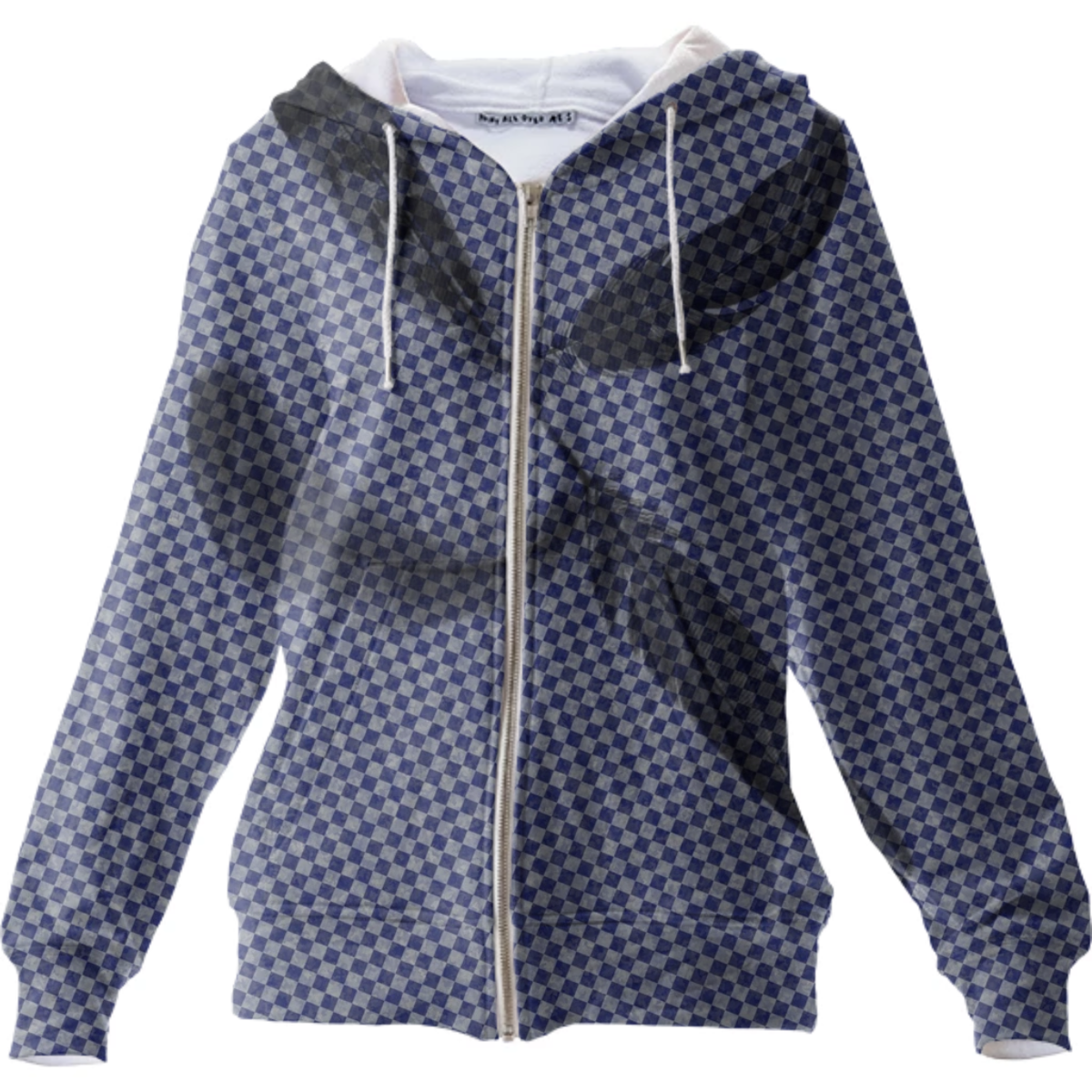 Slim fitting zip up hoodie with front kangaroo pockets metal zipper and drawstring hood.