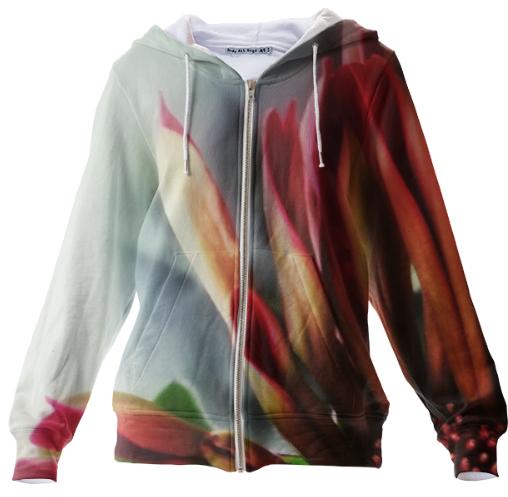 Slim fitting zip up hoodie with front kangaroo pockets metal zipper and drawstring hood.