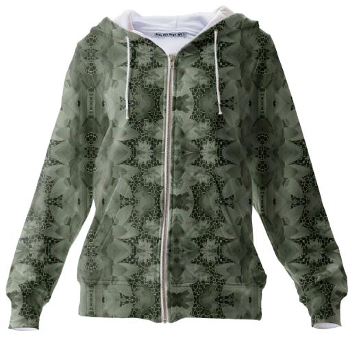 Slim fitting zip up hoodie with front kangaroo pockets metal zipper and drawstring hood.