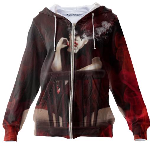 Slim fitting zip up hoodie with front kangaroo pockets metal zipper and drawstring hood.