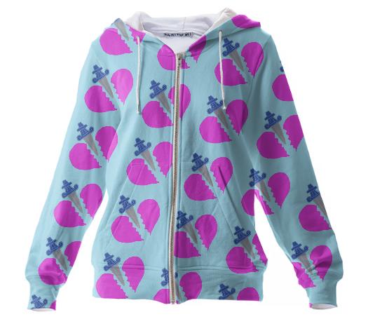 Slim fitting zip up hoodie with front kangaroo pockets metal zipper and drawstring hood.