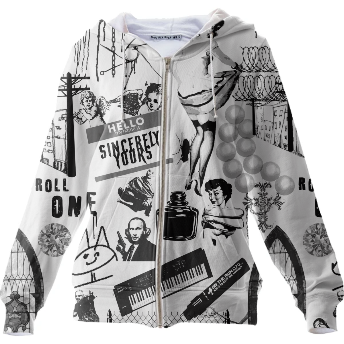 Slim fitting zip up hoodie with front kangaroo pockets metal zipper and drawstring hood.