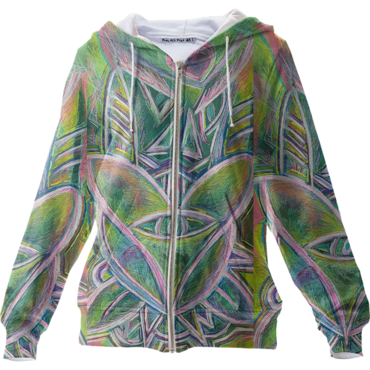 Slim fitting zip up hoodie with front kangaroo pockets metal zipper and drawstring hood.