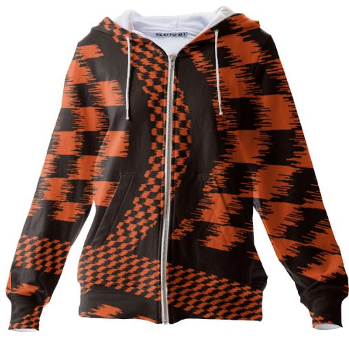 Slim fitting zip up hoodie with front kangaroo pockets metal zipper and drawstring hood.