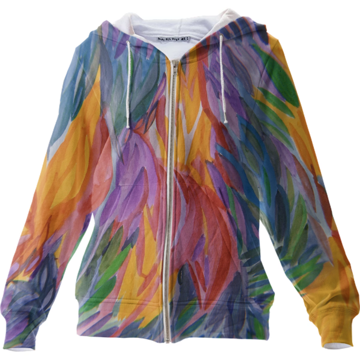 Slim fitting zip up hoodie with front kangaroo pockets metal zipper and drawstring hood.