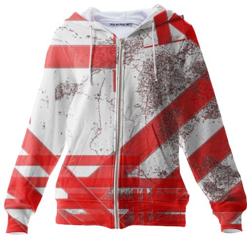 Slim fitting zip up hoodie with front kangaroo pockets metal zipper and drawstring hood.