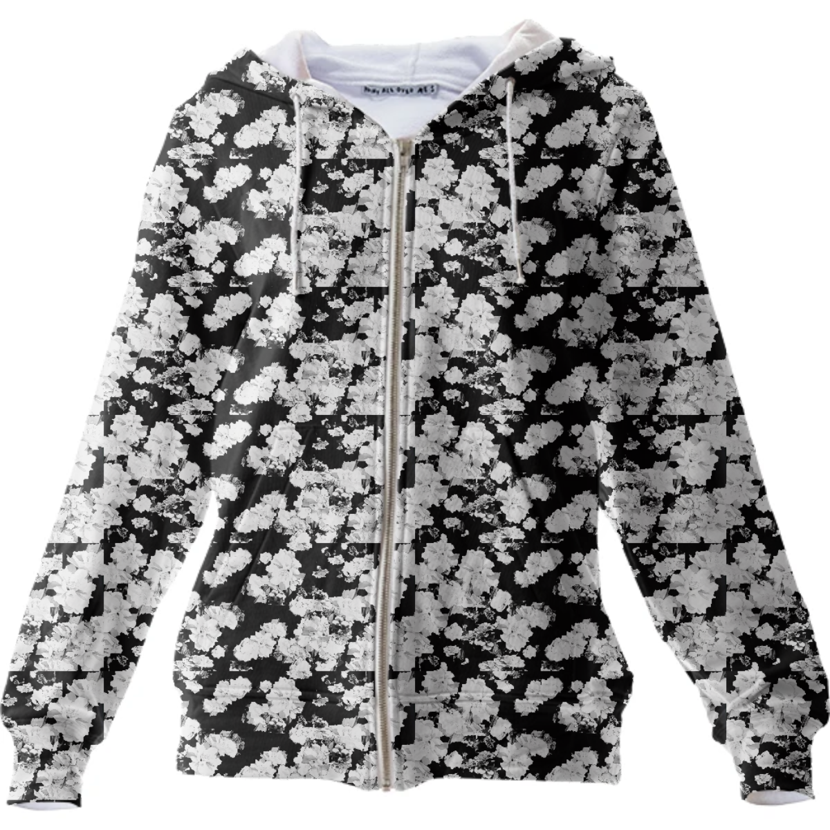 Slim fitting zip up hoodie with front kangaroo pockets metal zipper and drawstring hood.