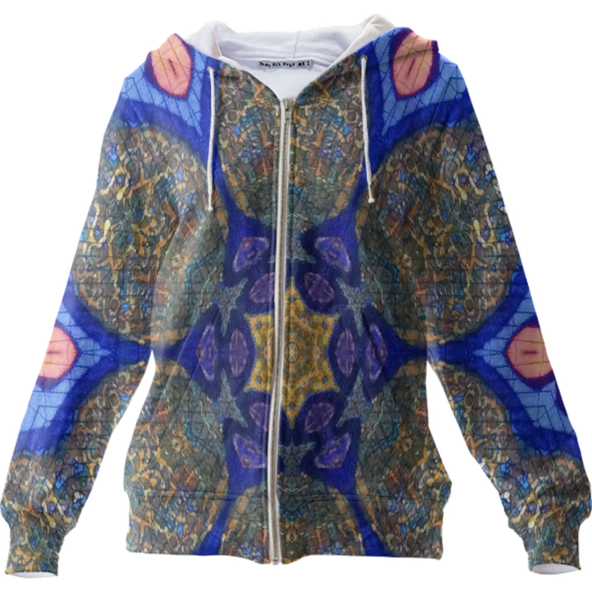 Slim fitting zip up hoodie with front kangaroo pockets metal zipper and drawstring hood.