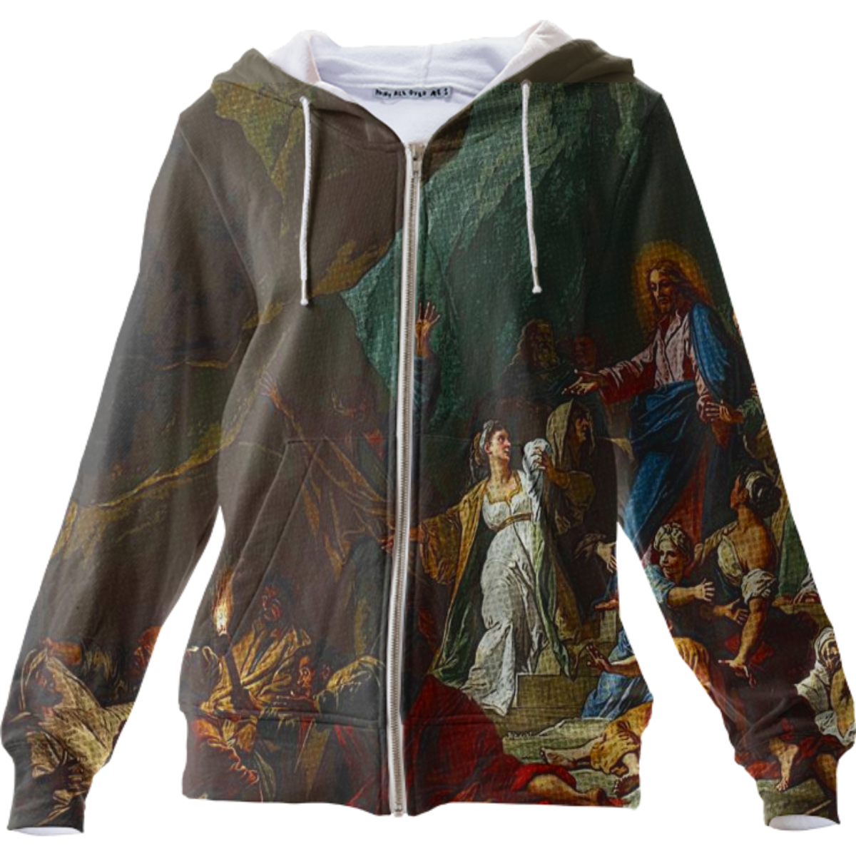Slim fitting zip up hoodie with front kangaroo pockets metal zipper and drawstring hood.