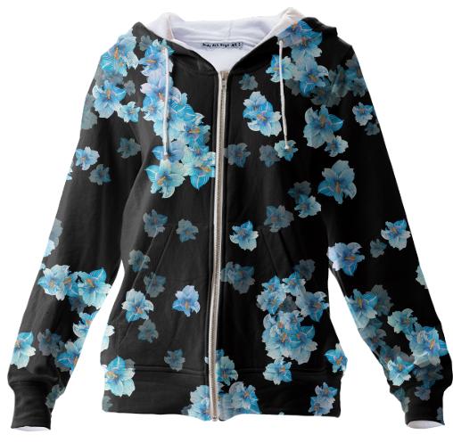 Slim fitting zip up hoodie with front kangaroo pockets metal zipper and drawstring hood.