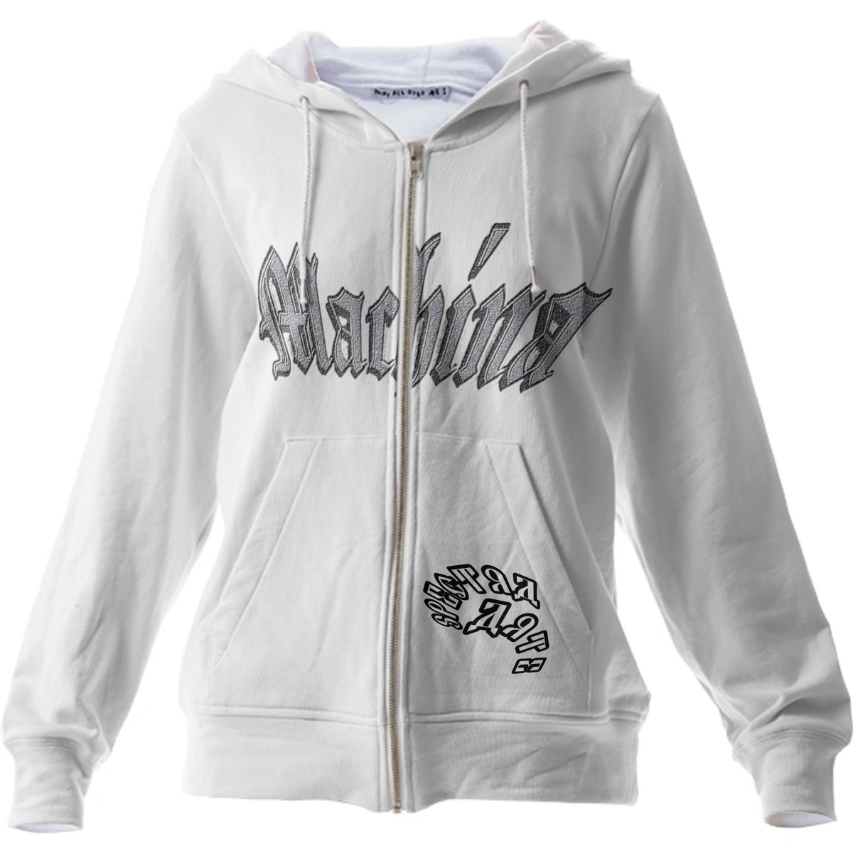 Slim fitting zip up hoodie with front kangaroo pockets metal zipper and drawstring hood.