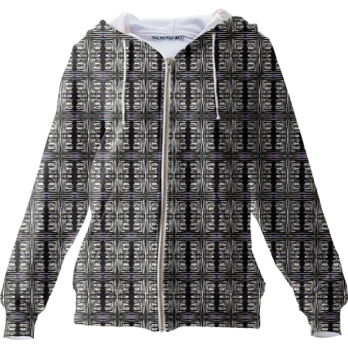 Slim fitting zip up hoodie with front kangaroo pockets metal zipper and drawstring hood.