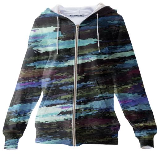 Slim fitting zip up hoodie with front kangaroo pockets metal zipper and drawstring hood.