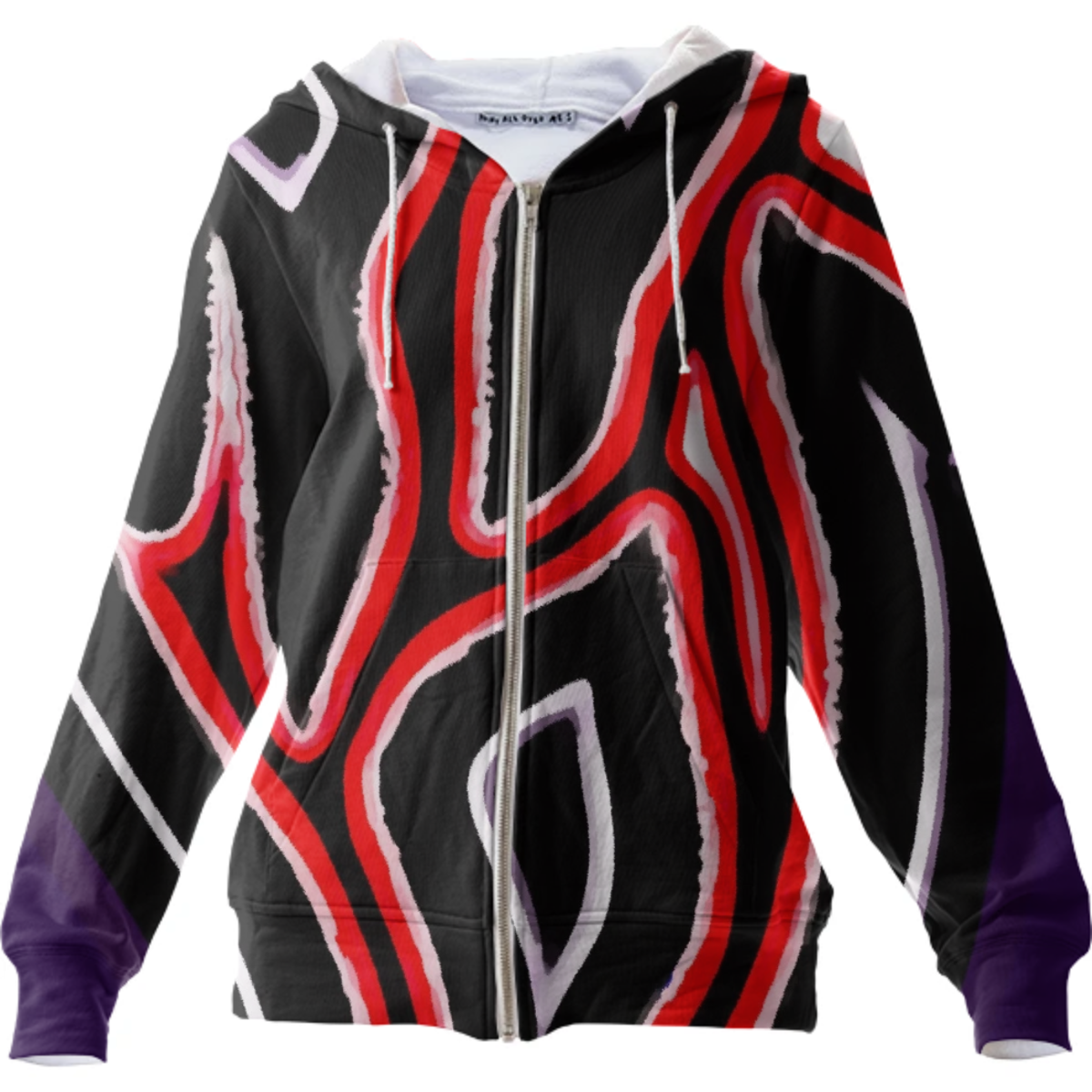 Slim fitting zip up hoodie with front kangaroo pockets metal zipper and drawstring hood.