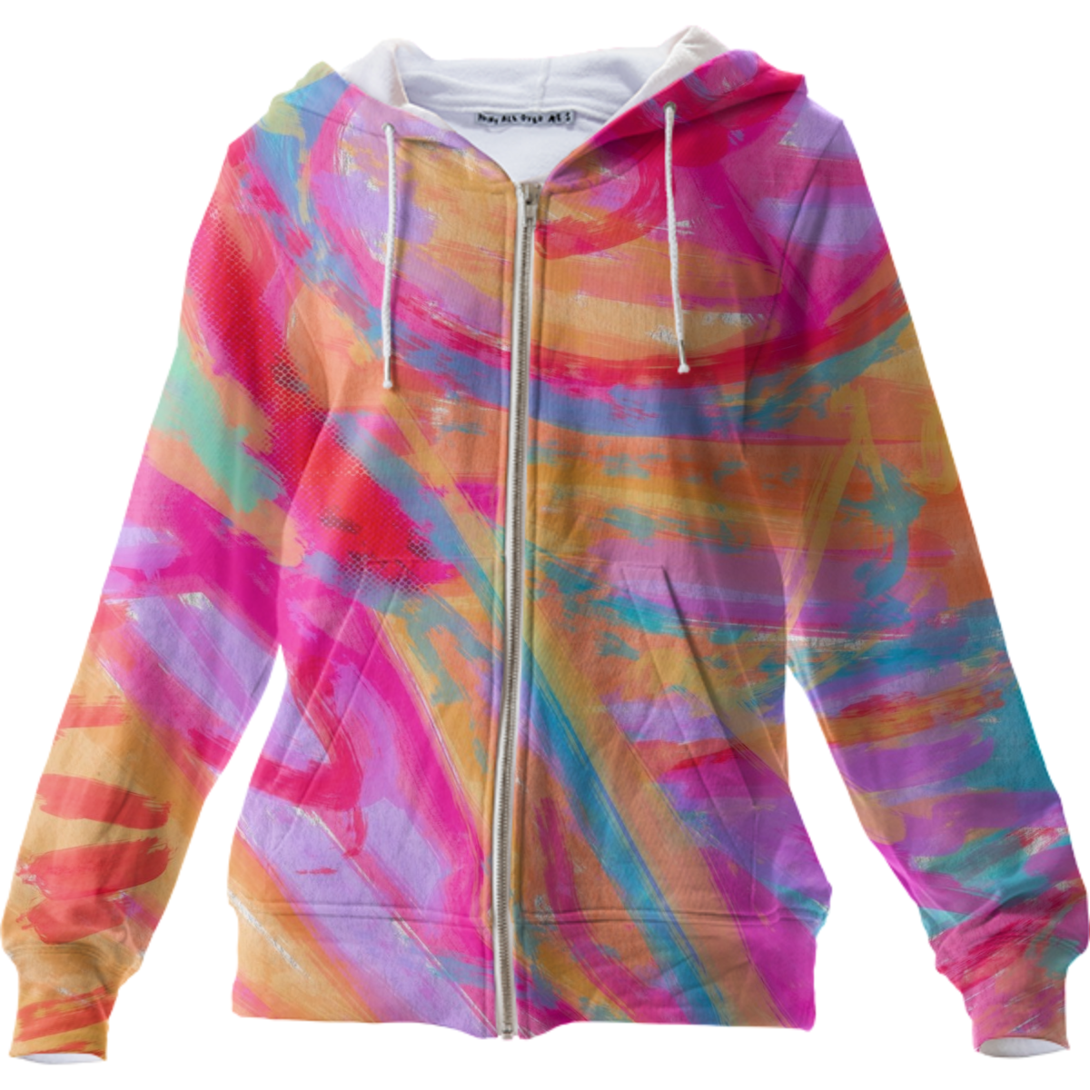 Slim fitting zip up hoodie with front kangaroo pockets metal zipper and drawstring hood.