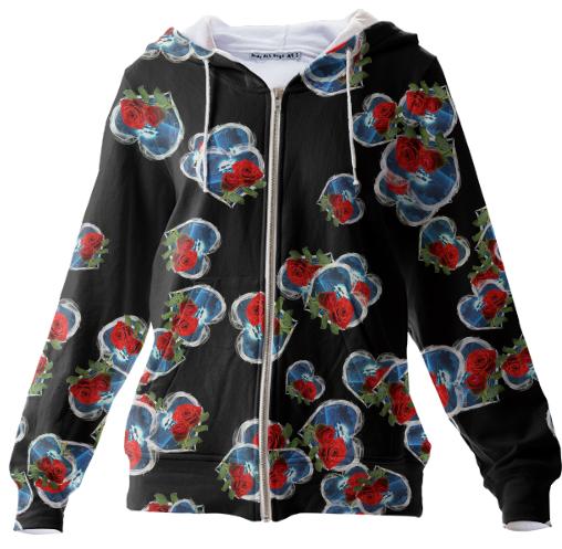 Slim fitting zip up hoodie with front kangaroo pockets metal zipper and drawstring hood.