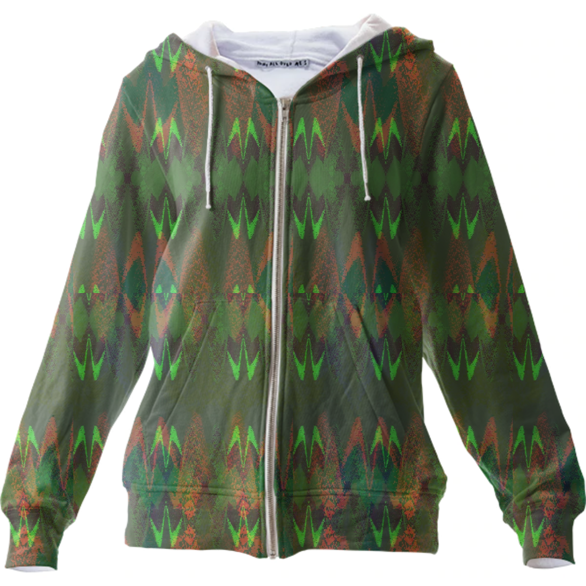 Slim fitting zip up hoodie with front kangaroo pockets metal zipper and drawstring hood.