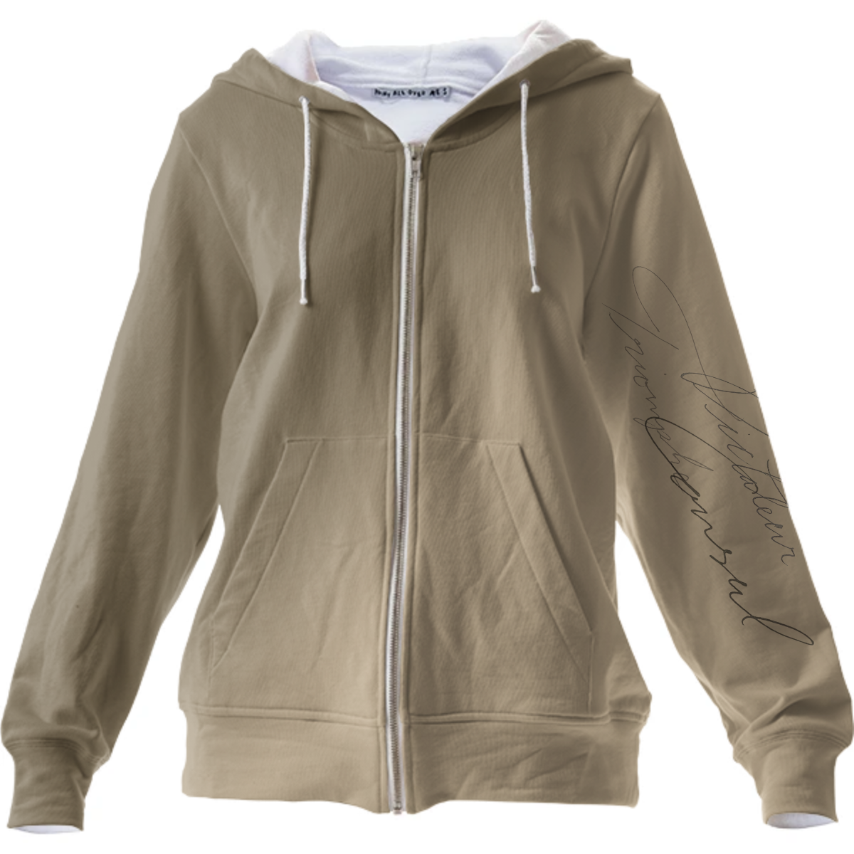 Slim fitting zip up hoodie with front kangaroo pockets metal zipper and drawstring hood.