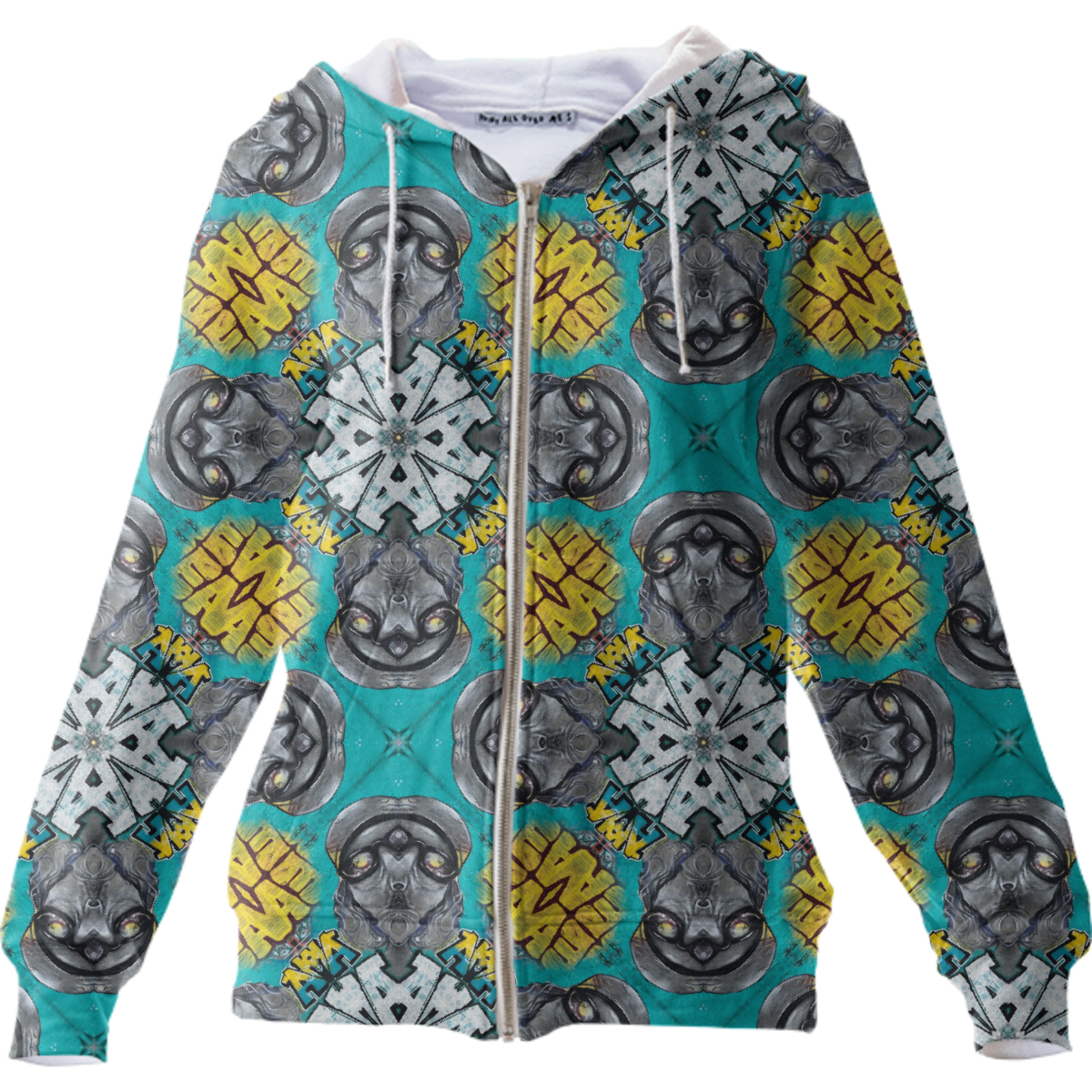 Slim fitting zip up hoodie with front kangaroo pockets metal zipper and drawstring hood.