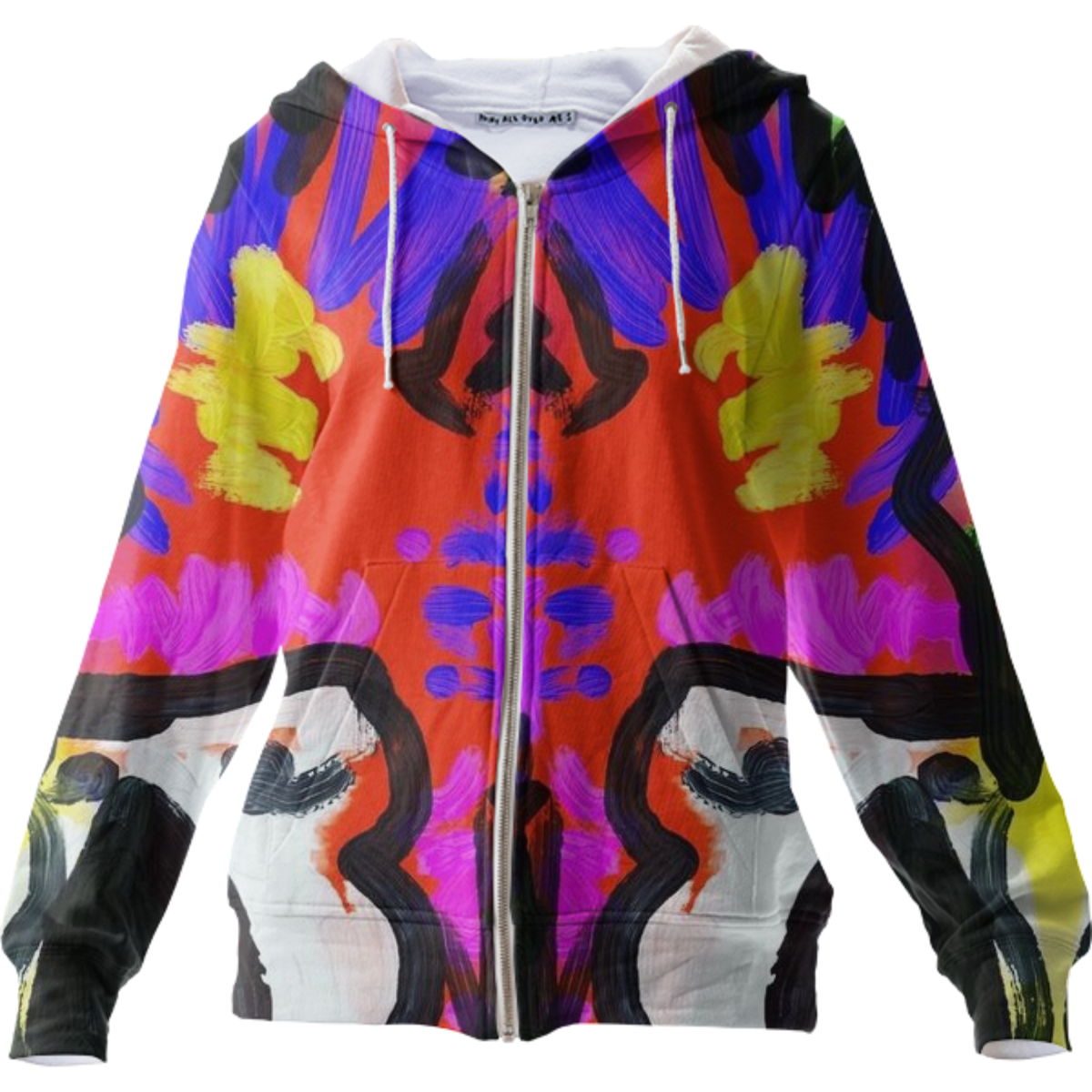 Slim fitting zip up hoodie with front kangaroo pockets metal zipper and drawstring hood.