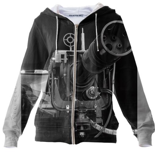 Slim fitting zip up hoodie with front kangaroo pockets metal zipper and drawstring hood.