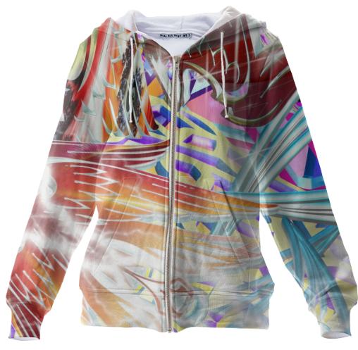 Slim fitting zip up hoodie with front kangaroo pockets metal zipper and drawstring hood.