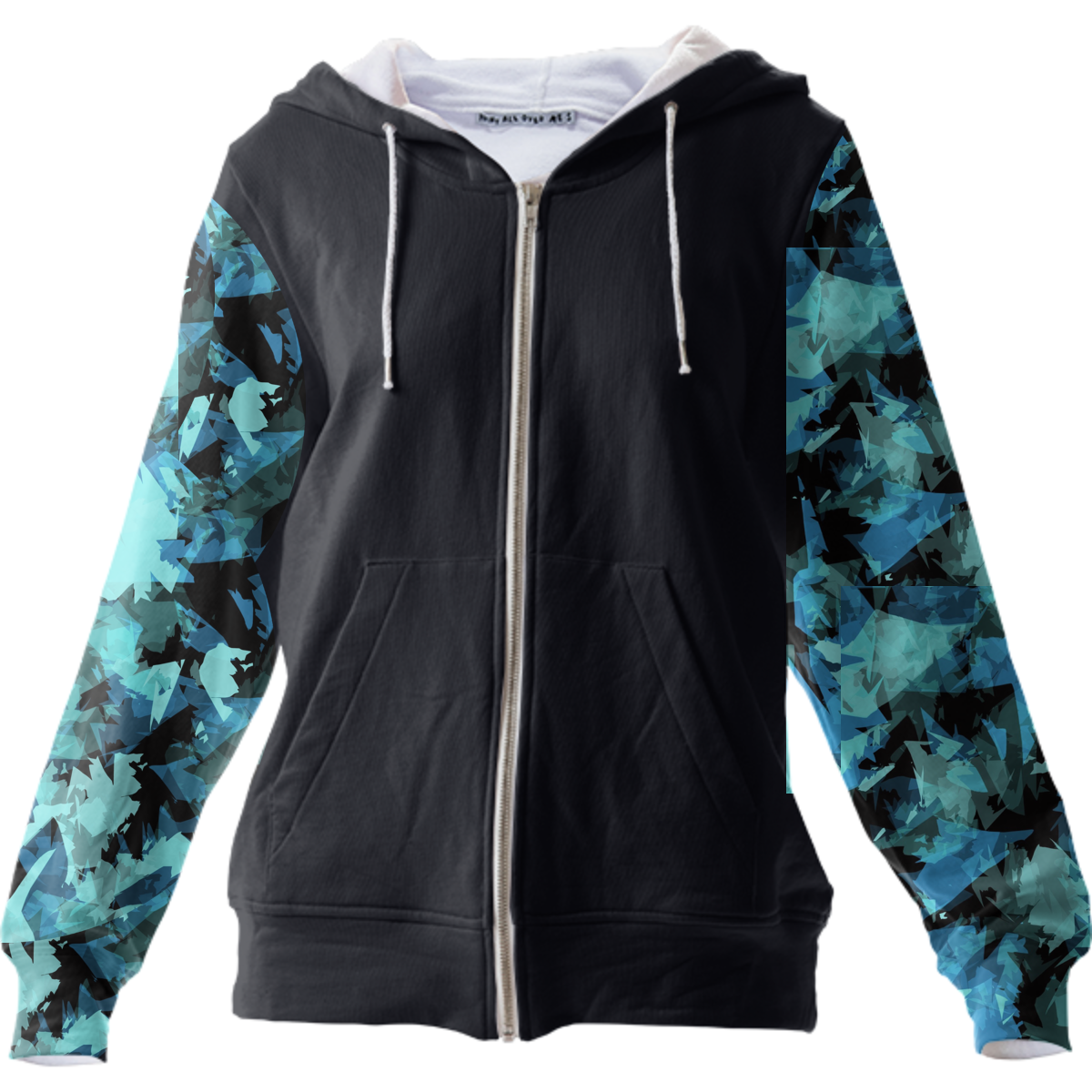 Slim fitting zip up hoodie with front kangaroo pockets metal zipper and drawstring hood.