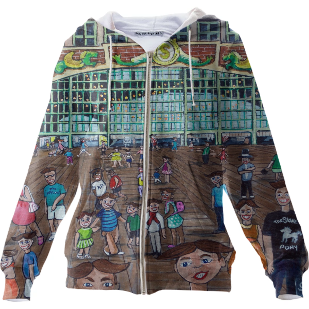 Slim fitting zip up hoodie with front kangaroo pockets metal zipper and drawstring hood.