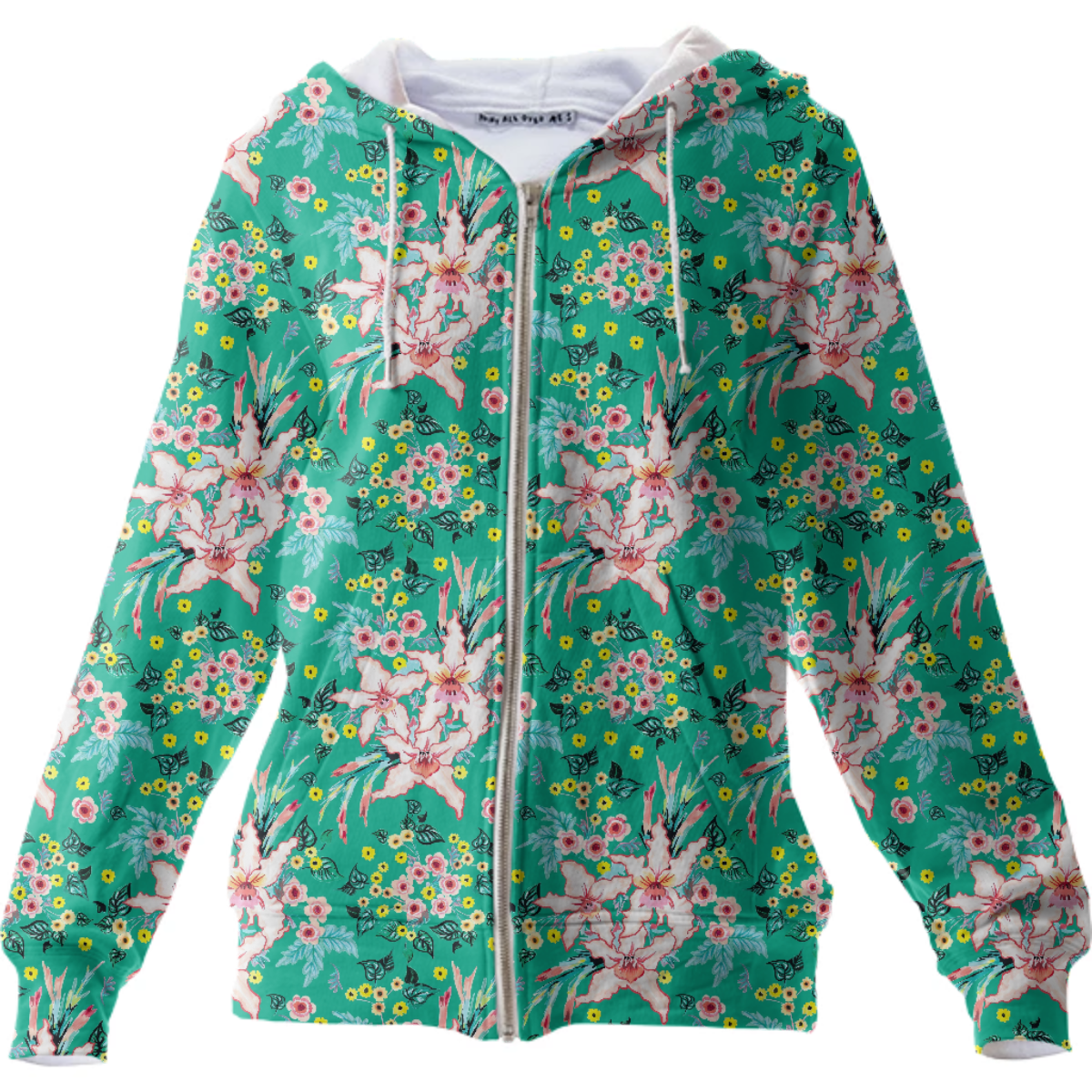 Slim fitting zip up hoodie with front kangaroo pockets metal zipper and drawstring hood.