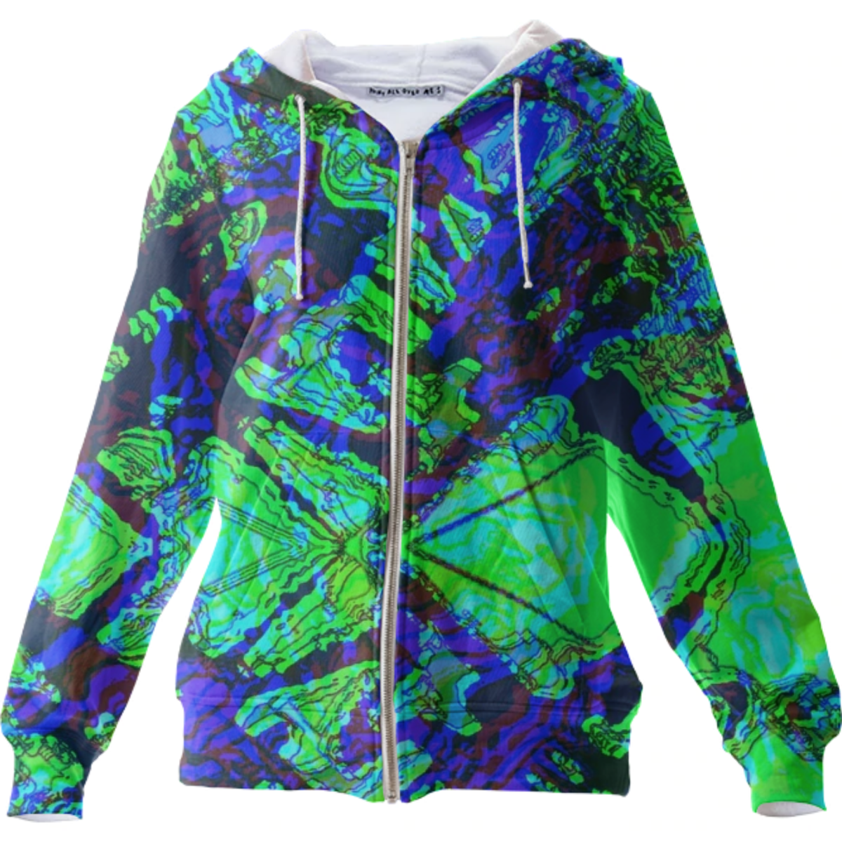 Slim fitting zip up hoodie with front kangaroo pockets metal zipper and drawstring hood.