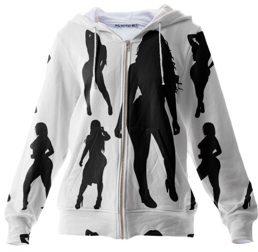 Slim fitting zip up hoodie with front kangaroo pockets metal zipper and drawstring hood.