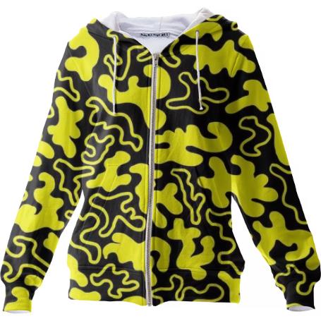 Slim fitting zip up hoodie with front kangaroo pockets metal zipper and drawstring hood.