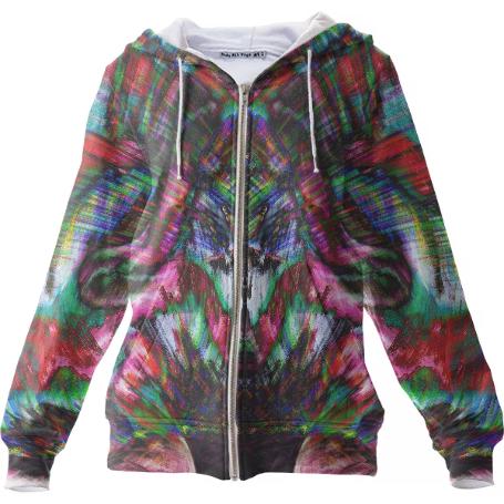 Slim fitting zip up hoodie with front kangaroo pockets metal zipper and drawstring hood.