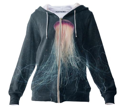 Slim fitting zip up hoodie with front kangaroo pockets metal zipper and drawstring hood.
