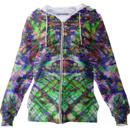 Slim fitting zip up hoodie with front kangaroo pockets metal zipper and drawstring hood.