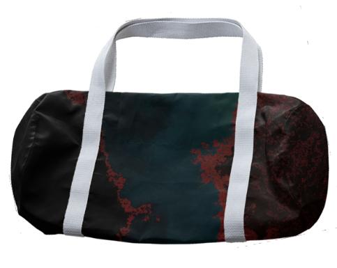 Medium sized duffle bag with white or black webbing straps metal zipper and inside pocket. Great for weekend trips or as a gym bag.