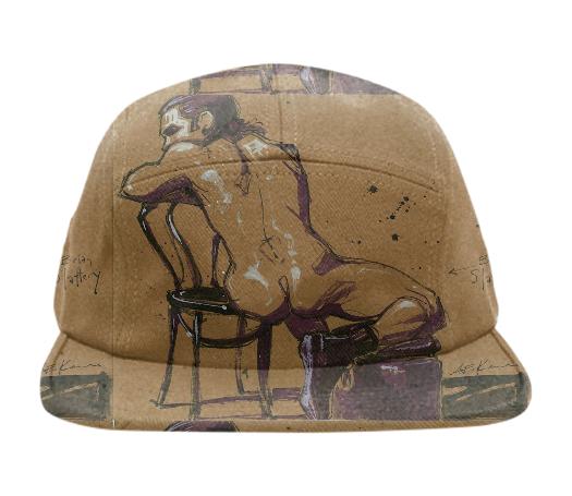 Five panel baseball hat with adjustable nylon strap for sizing.