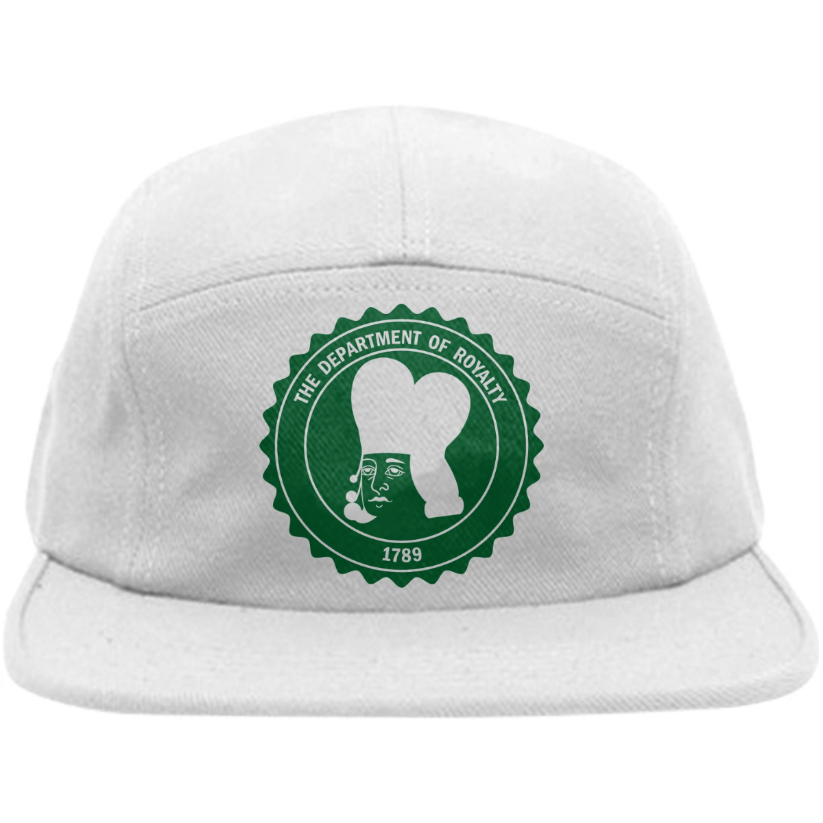 Five panel baseball hat with adjustable nylon strap for sizing.