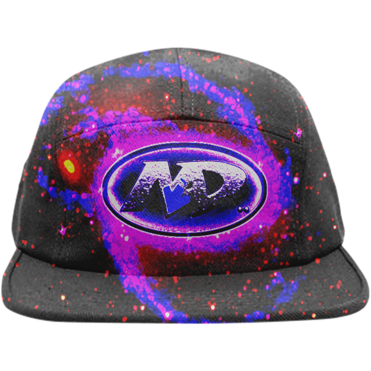 Five panel baseball hat with adjustable nylon strap for sizing.