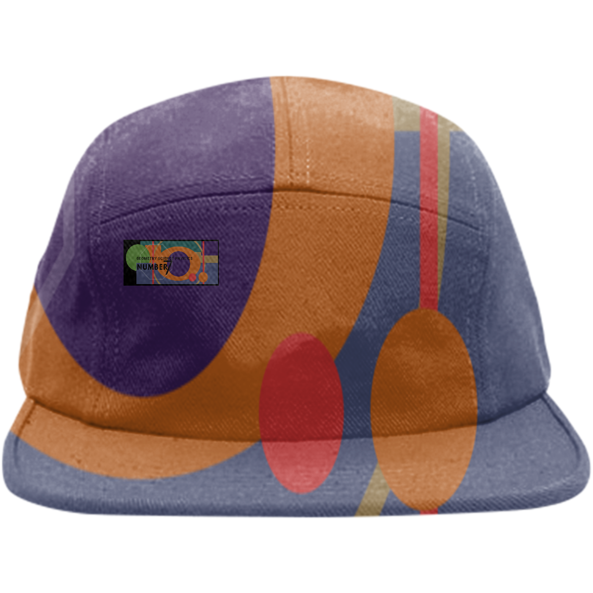 Five panel baseball hat with adjustable nylon strap for sizing.