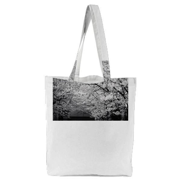 Grayscale Photo Of Trees During Daytime Tote Bag