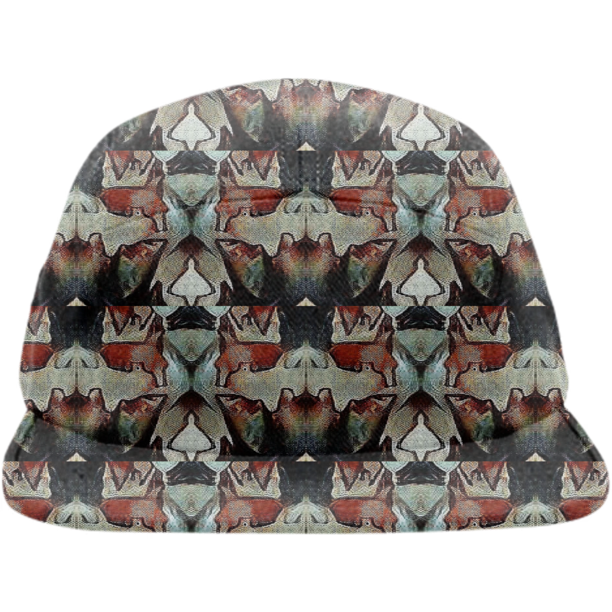 Five panel baseball hat with adjustable nylon strap for sizing.